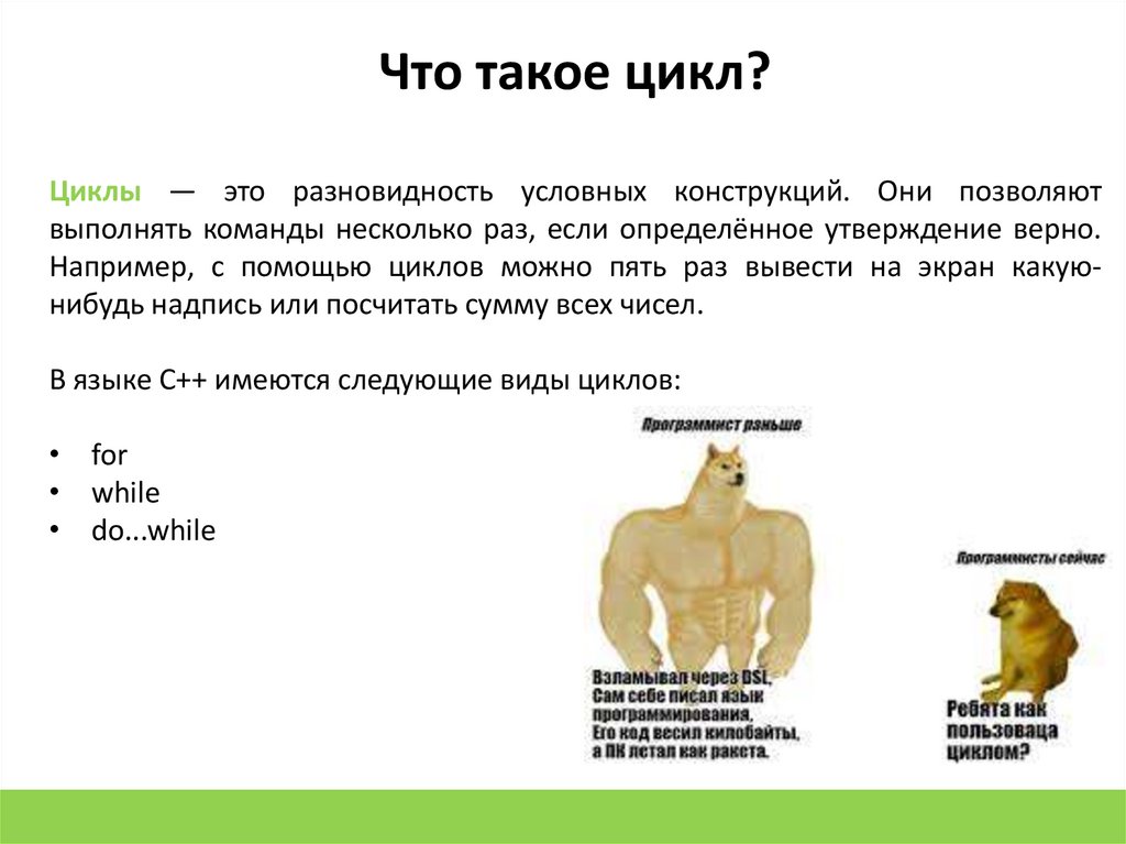 Что такое цикл?Циклы — это разновидность условных конструкций. Они позволяют