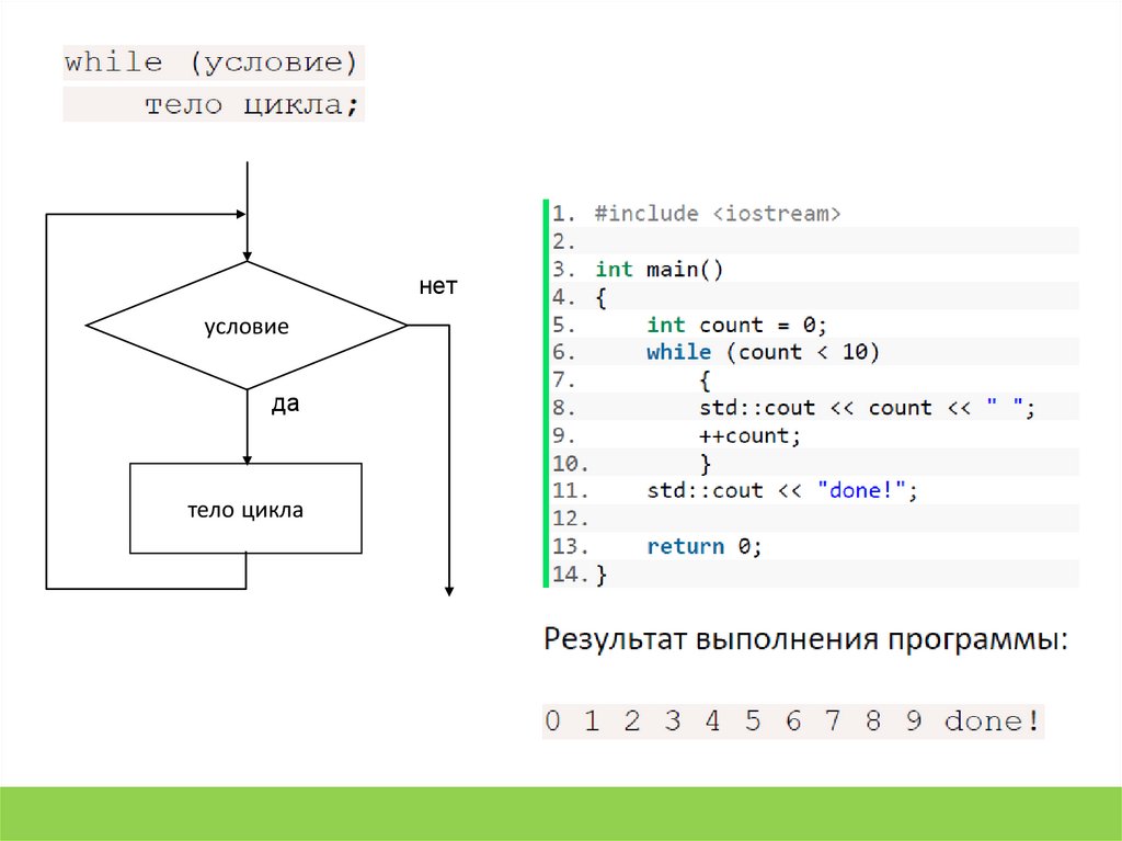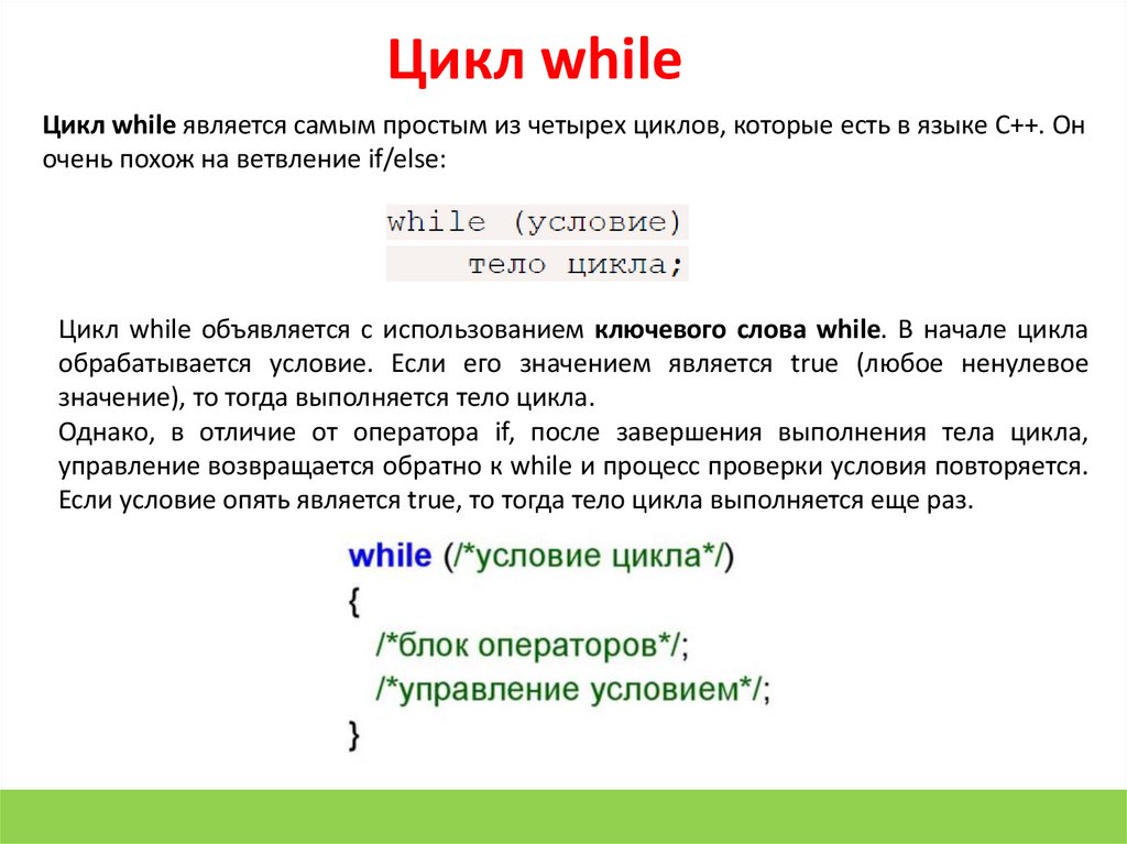 Цикл whileЦикл while является самым простым из четырех циклов, которые есть в языке C++. Он