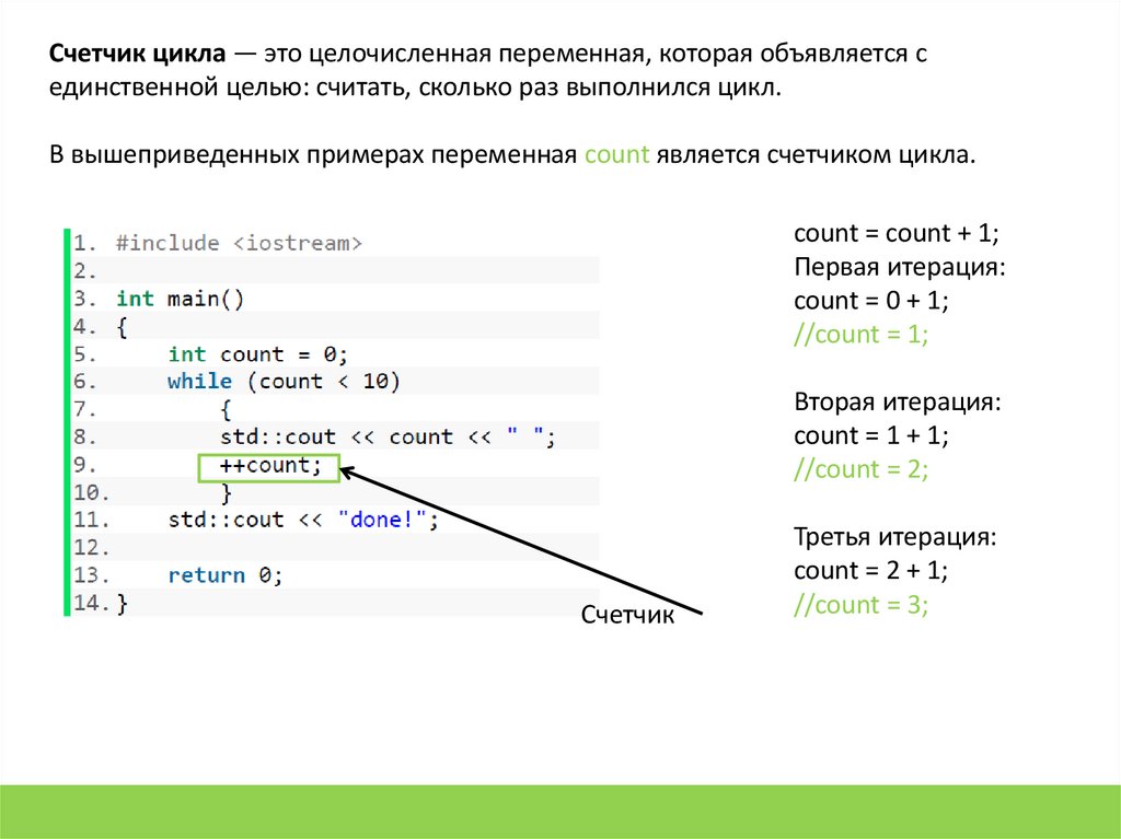 Счетчик цикла — это целочисленная переменная, которая объявляется сединственной целью: считать, сколько раз выполнился цикл.