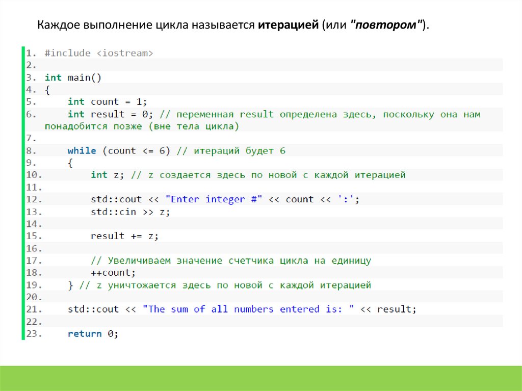 Каждое выполнение цикла называется итерацией (или "повтором").9.