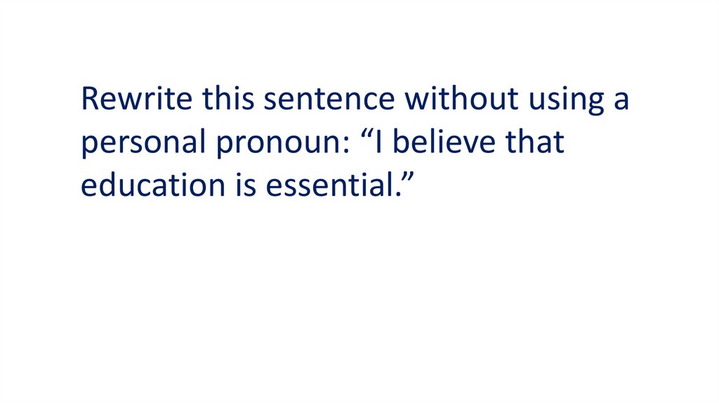 Rewrite this sentence without using apersonal pronoun: “I believe that