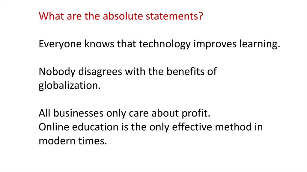 What are the absolute statements?Everyone knows that technology improves learning.