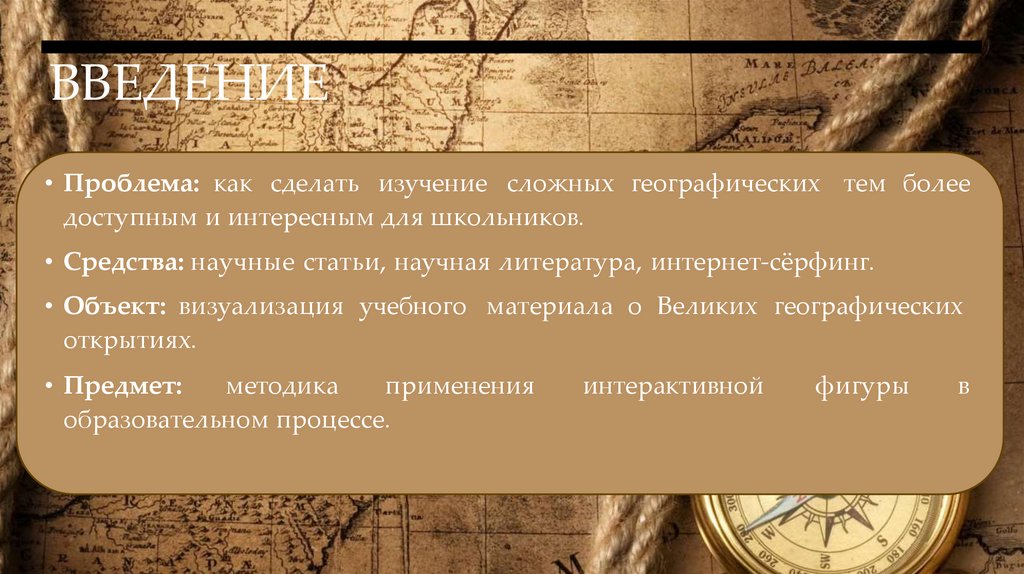 • Объект: визуализация учебного материала о Великих географических