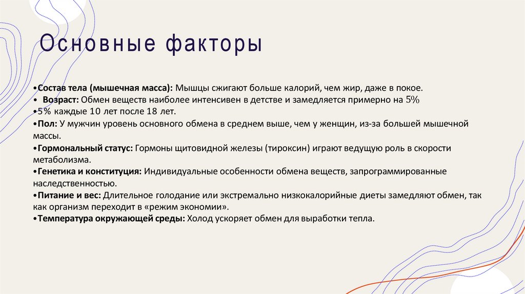 Основные факторы• Состав тела (мышечная масса): Мышцы сжигают больше калорий, чем жир, даже в покое.
