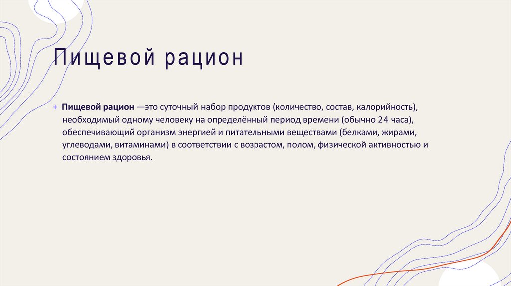 Пищевой рацион+ Пищевой рацион —это суточный набор продуктов (количество, состав, калорийность),