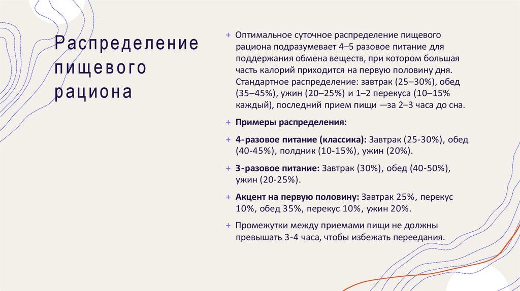 Стандартное распределение: завтрак (25–30%), обед