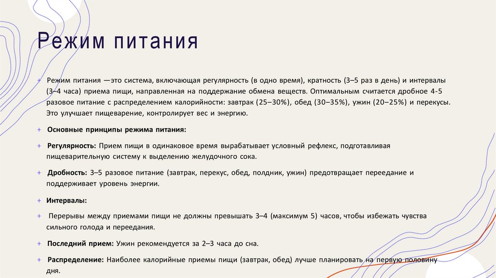 (3–4 часа) приема пищи, направленная на поддержание обмена веществ. Оптимальным считается дробное 4-5