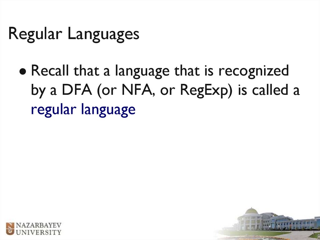 Recall that a language that is recognizedby a DFA (or NFA, or RegExp) is called a