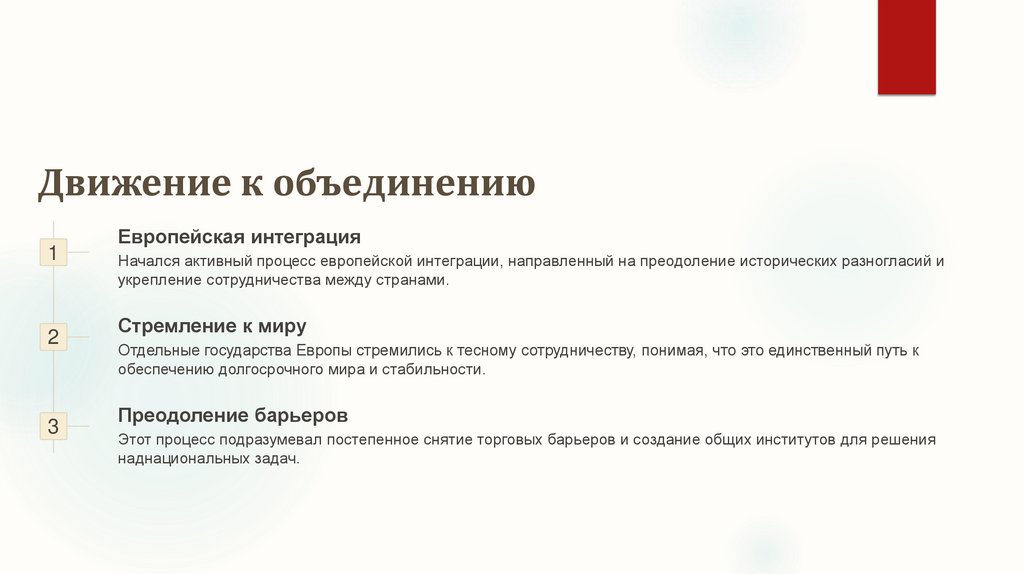 Этот процесс подразумевал постепенное снятие торговых барьеров и создание общих институтов для решения