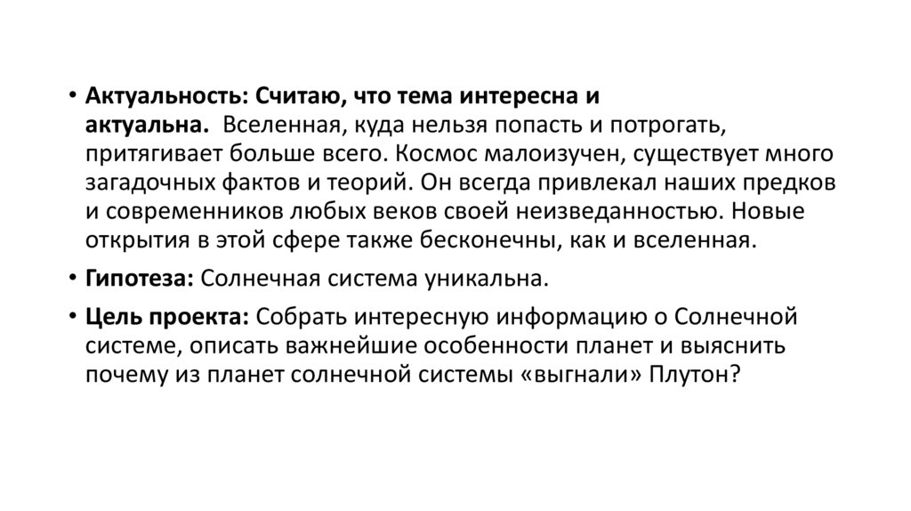 • Актуальность: Считаю, что тема интересна иактуальна. Вселенная, куда нельзя попасть и потрогать,
