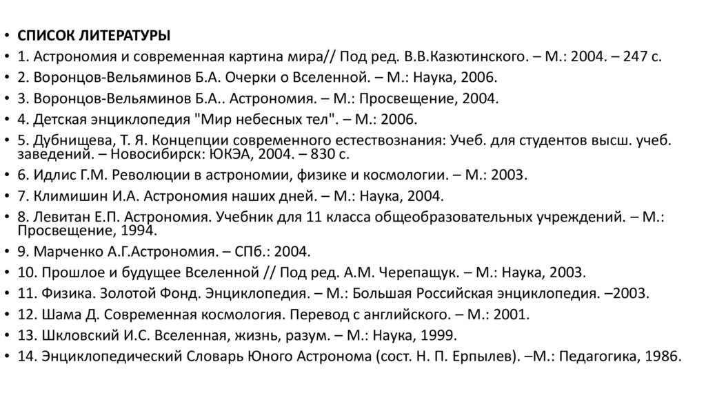 • СПИСОК ЛИТЕРАТУРЫ• 1. Астрономия и современная картина мира// Под ред. В.В.Казютинского. – М.: 2004. – 247 с.