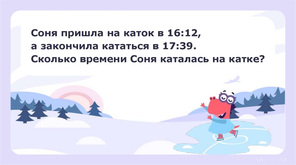 Соня пришла на каток в 16:12,а закончила кататься в 17:39.