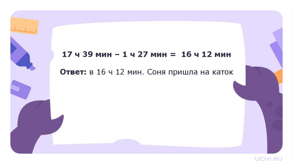 17 ч 39 мин – 1 ч 27 мин = 16 ч 12 минОтвет: в 16 ч 12 мин. Соня пришла на каток