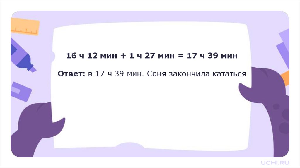 16 ч 12 мин + 1 ч 27 мин = 17 ч 39 минОтвет: в 17 ч 39 мин. Соня закончила кататься