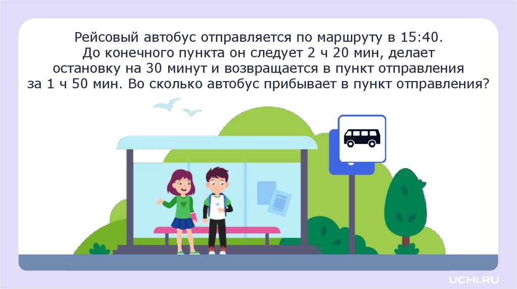 за 1 ч 50 мин. Во сколько автобус прибывает в пункт отправления?