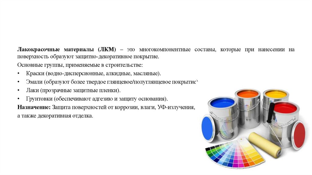 Лакокрасочные материалы (ЛКМ) – это многокомпонентные составы, которые при нанесении наповерхность образуют защитно-декоративное покрытие.