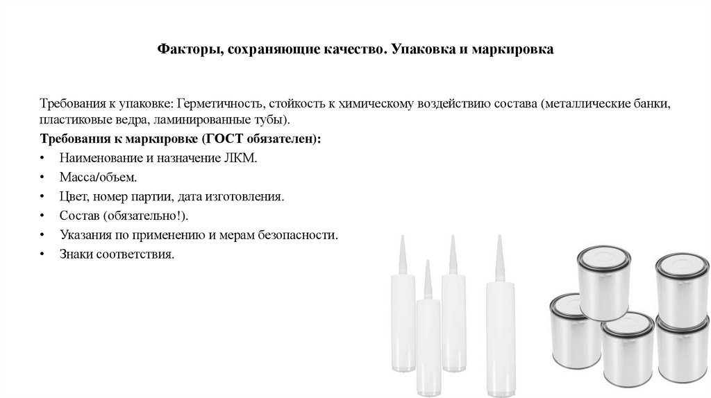 Факторы, сохраняющие качество. Упаковка и маркировкаТребования к упаковке: Герметичность, стойкость к химическому воздействию состава (металлические банки,