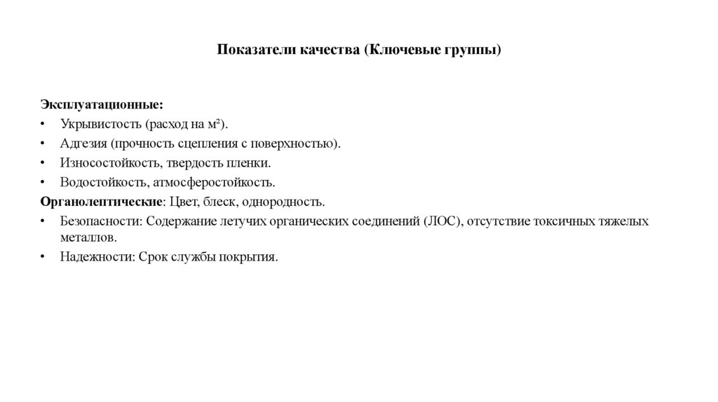 Показатели качества (Ключевые группы)Эксплуатационные: