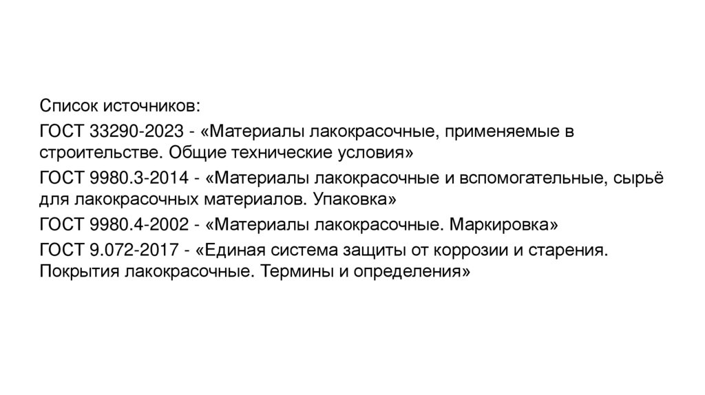Список источников:ГОСТ 33290-2023 - «Материалы лакокрасочные, применяемые в