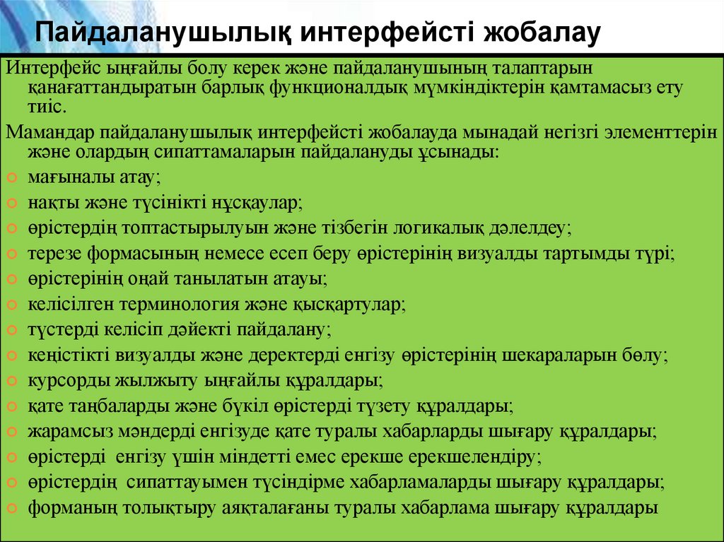 Мамандар пайдаланушылық интерфейсті жобалауда мынадай негізгі элементтерін