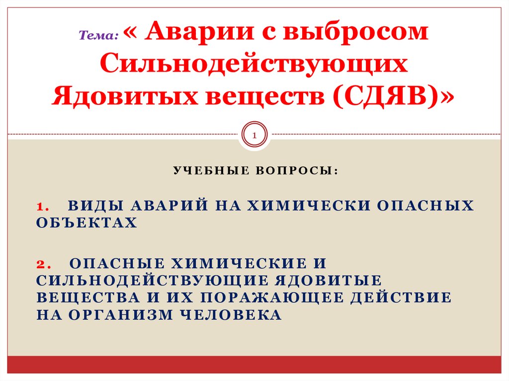 1. Тема: « Аварии с выбросом Сильнодействующих Ядовитых веществ (СДЯВ)»