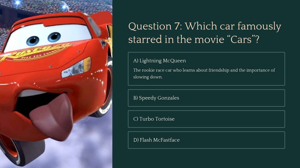 Question 7: Which car famouslystarred in the movie “Cars”?