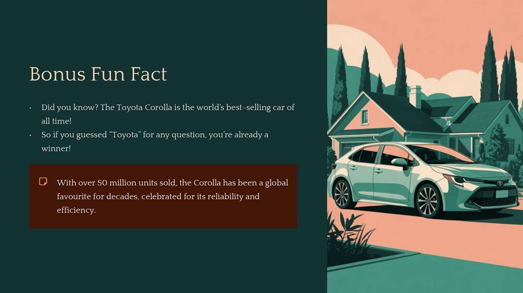 Bonus Fun FactDid you know? The Toyota Corolla is the world’s best-selling car of