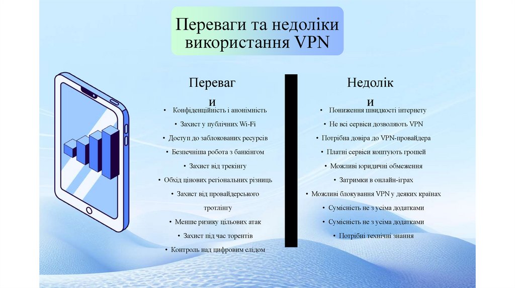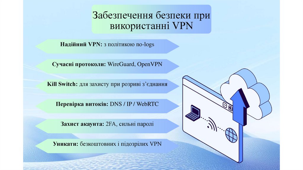 • VPN не захищає від вірусів, він лише шифрує з’єднання.
