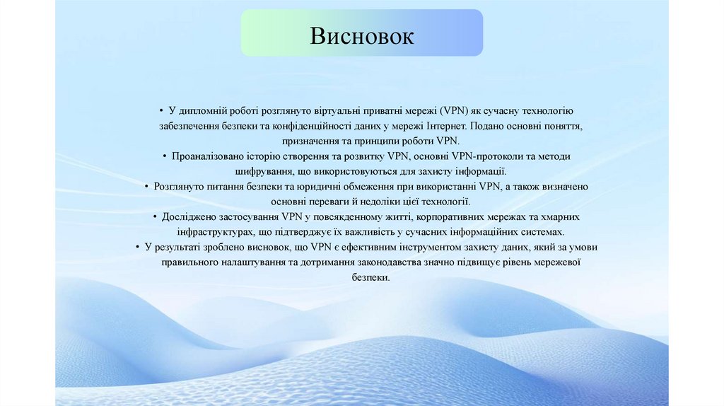 Висновок• У дипломній роботі розглянуто віртуальні приватні мережі (VPN) як сучасну технологію