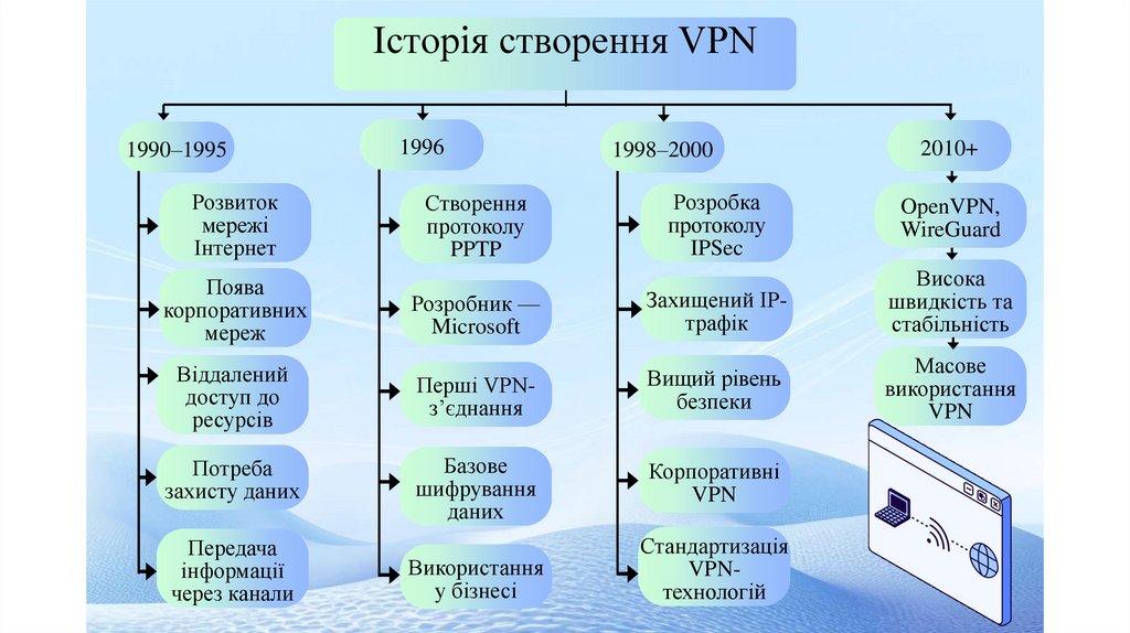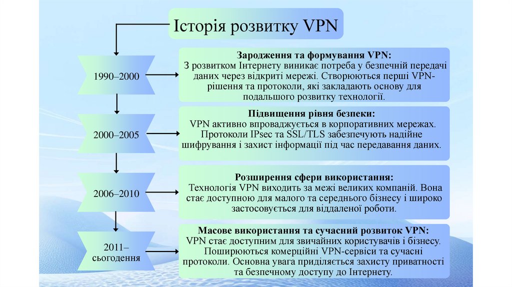 • Проаналізовано історію створення та розвитку VPN, основні VPN-протоколи та методи