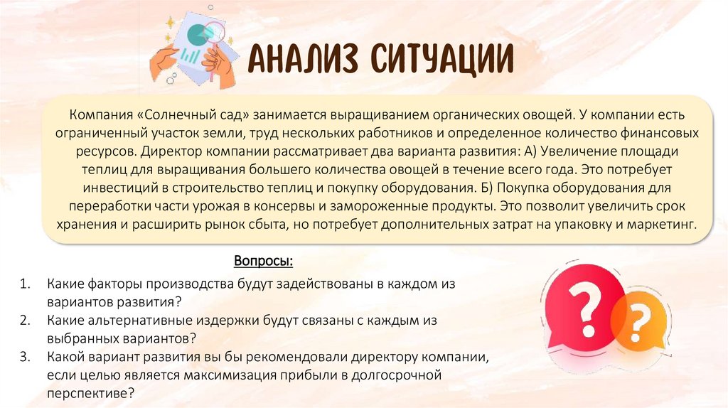 Анализ ситуацииКомпания «Солнечный сад» занимается выращиванием органических овощей. У компании есть