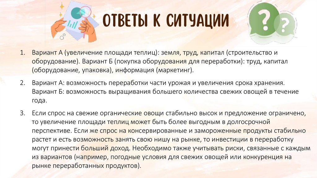 Ответы к ситуации1. Вариант А (увеличение площади теплиц): земля, труд, капитал (строительство и