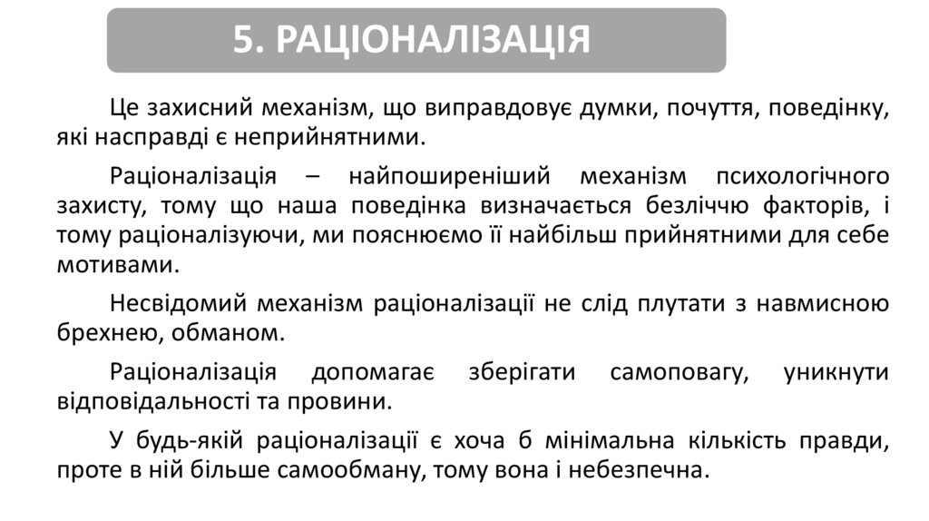 5. РАЦІОНАЛІЗАЦІЯЦе захисний механізм, що виправдовує думки, почуття, поведінку,