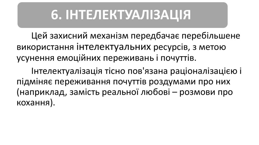 6. ІНТЕЛЕКТУАЛІЗАЦІЯЦей захисний механізм передбачає перебільшене