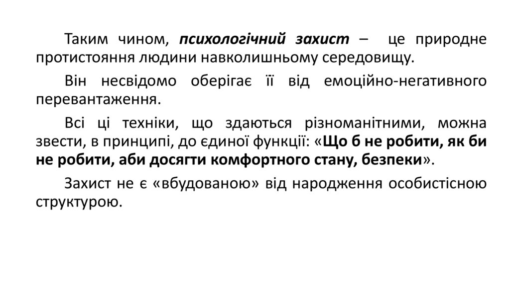 Таким чином, психологічний захист – це природнепротистояння людини навколишньому середовищу.