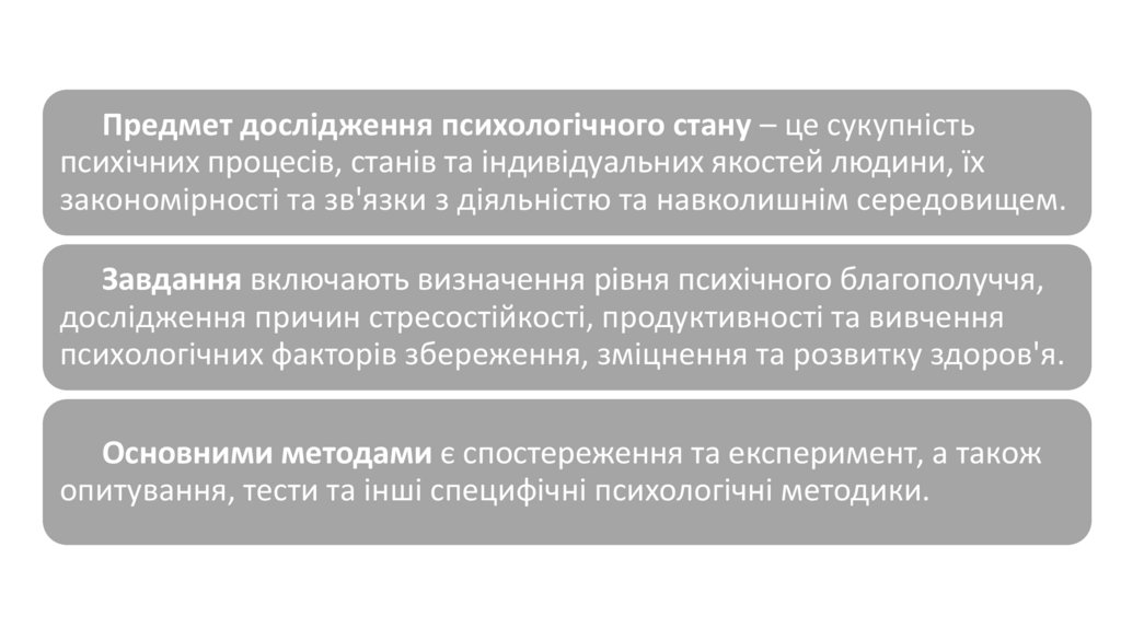 Предмет дослідження психологічного стану – це сукупністьпсихічних процесів, станів та індивідуальних якостей людини, їх