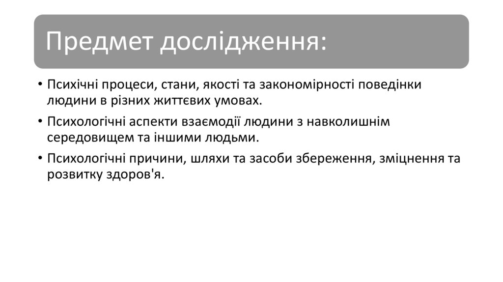 Предмет дослідження:• Психічні процеси, стани, якості та закономірності поведінки