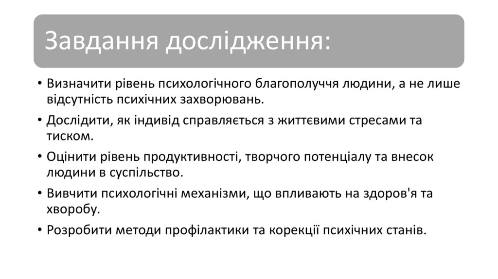Завдання дослідження:• Визначити рівень психологічного благополуччя людини, а не лише