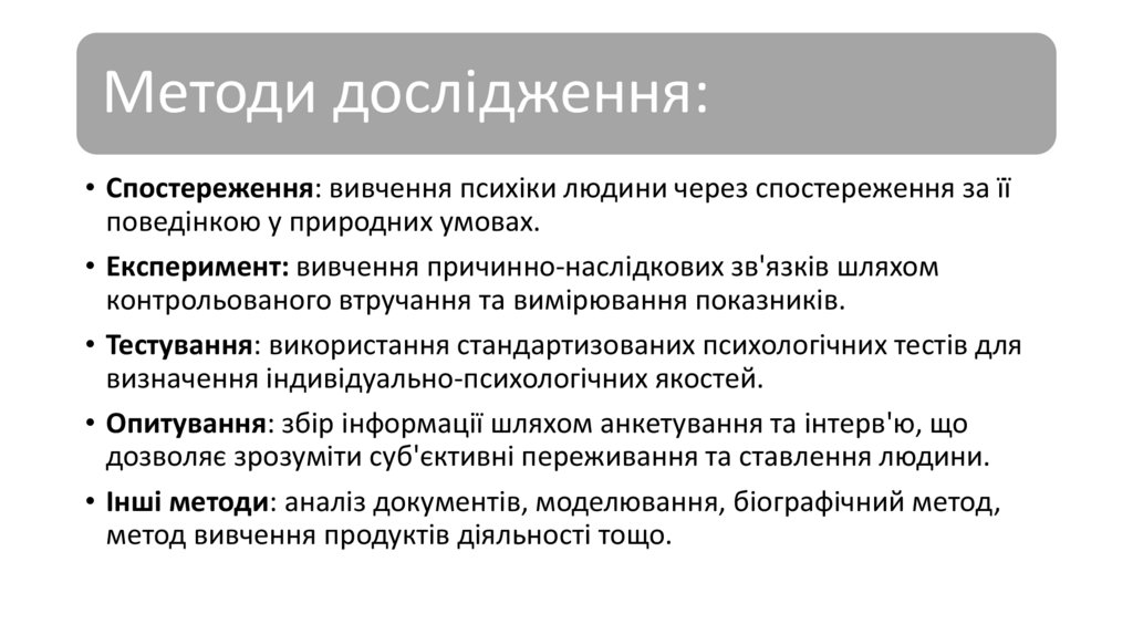 Методи дослідження:• Спостереження: вивчення психіки людини через спостереження за її
