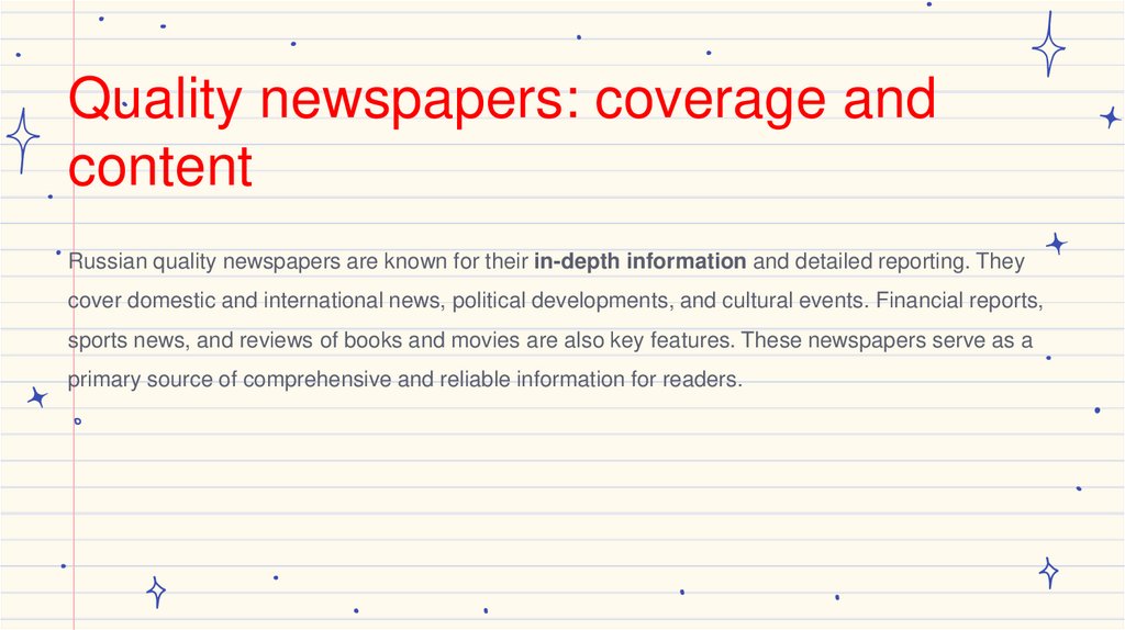 Russian quality newspapers are known for their in-depth information and detailed reporting. They