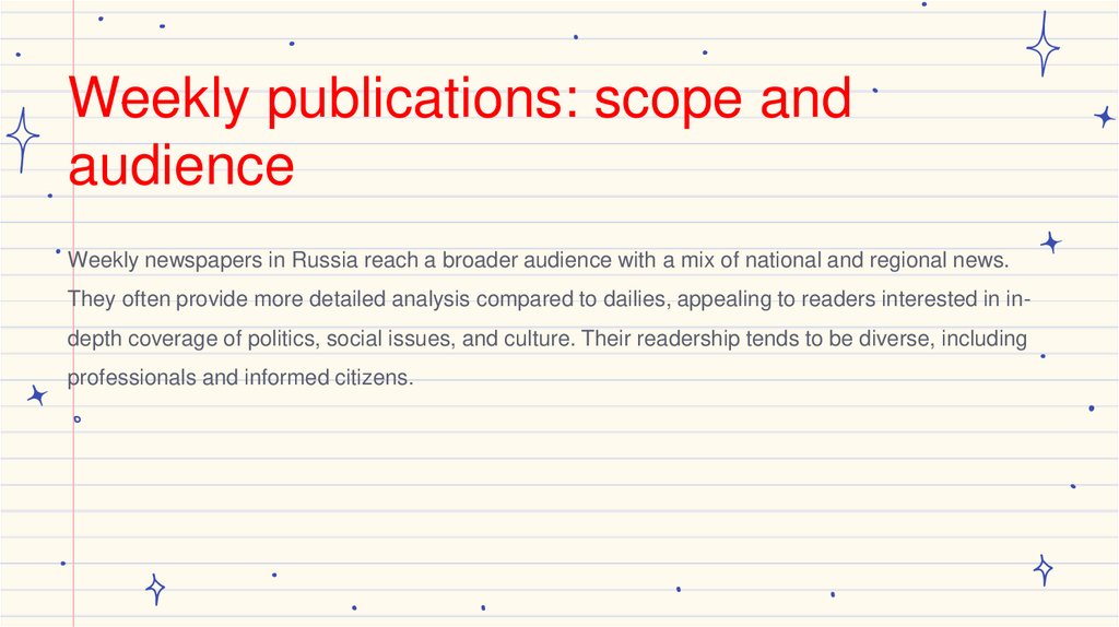They often provide more detailed analysis compared to dailies, appealing to readers interested in indepth coverage of politics, social issues, and culture. Their readership tends to be diverse, including