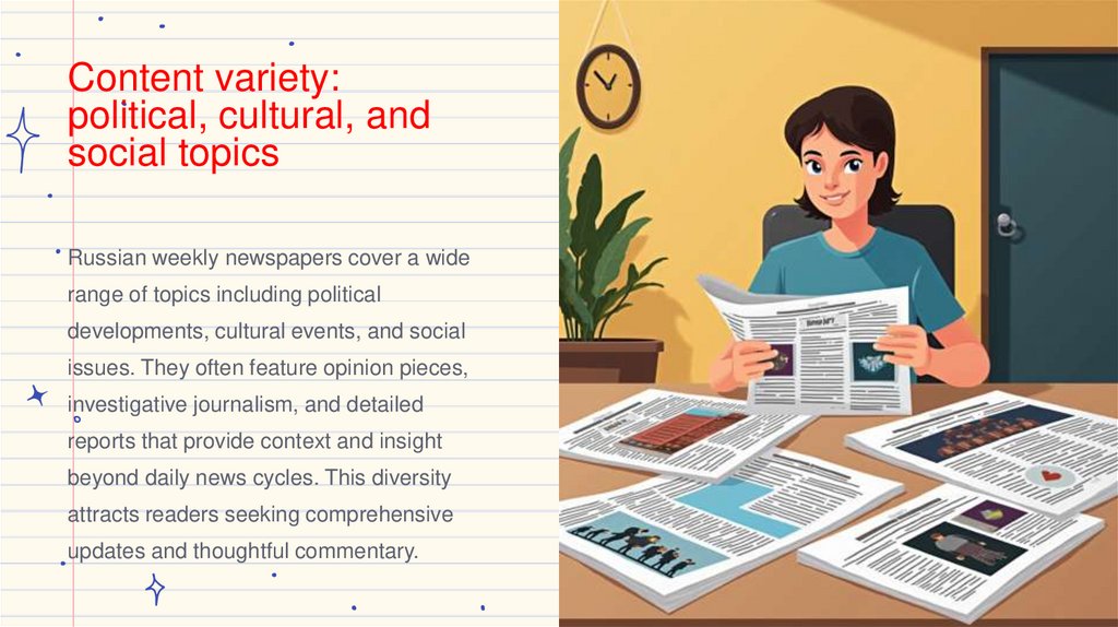 Russian newspapers, whether daily or weekly,serve distinct yet complementary purposes. Daily