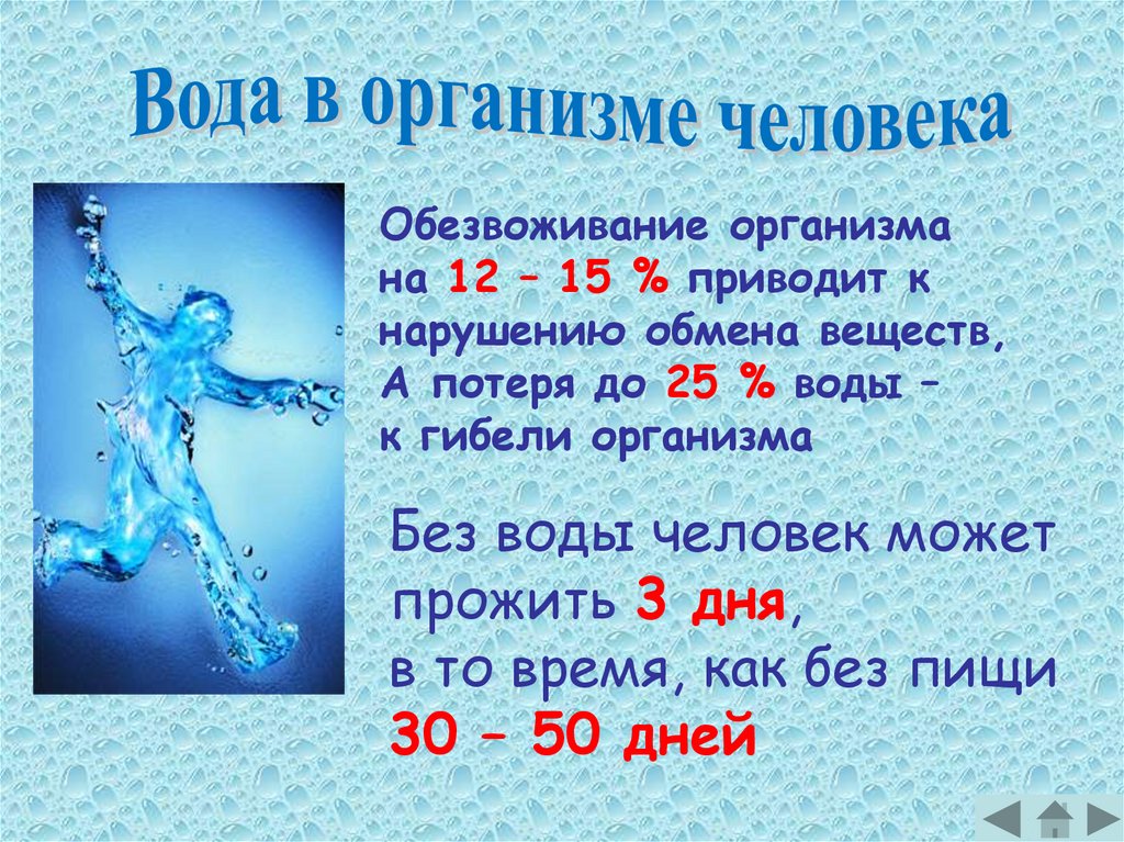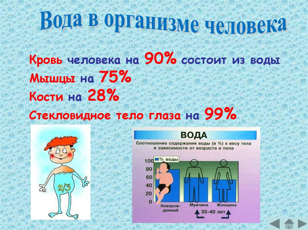 Кровь человека на 90% состоит из водыМышцы на 75%