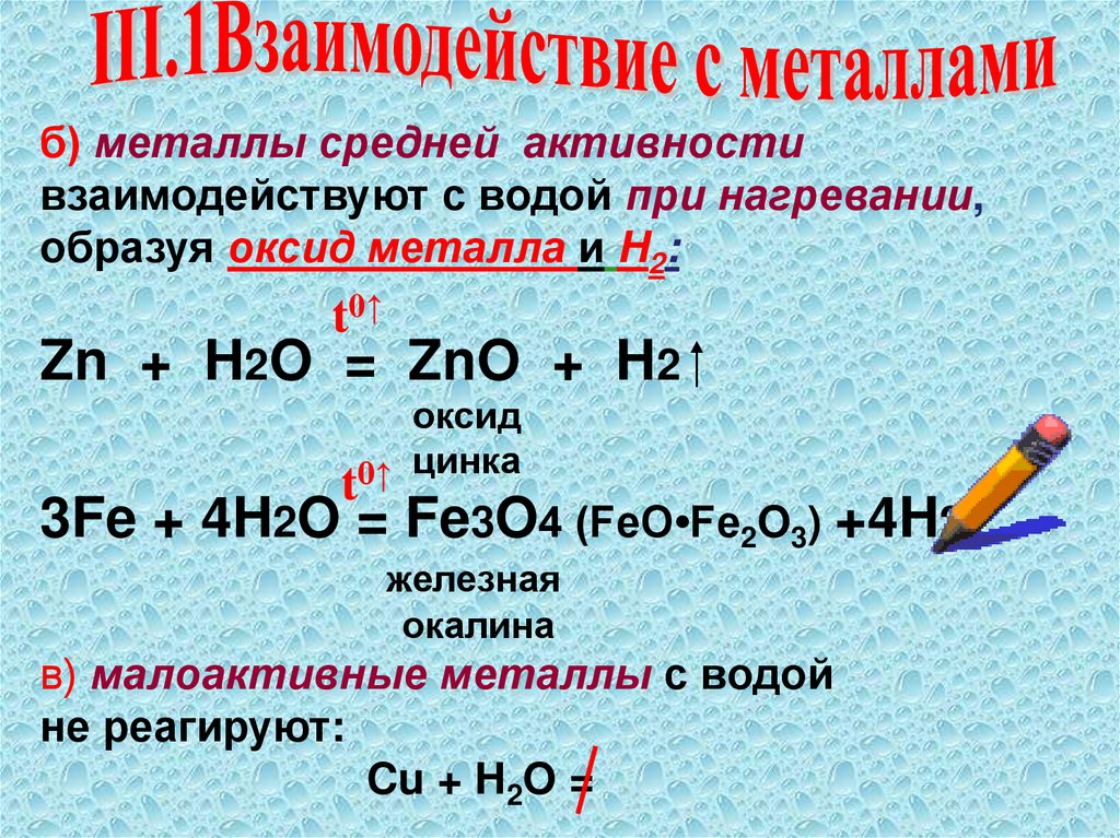 б) металлы средней активностивзаимодействуют с водой при нагревании,