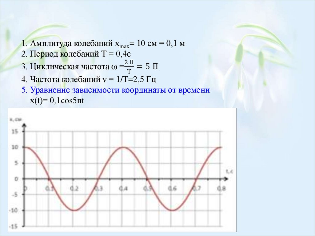 1. Амплитуда колебаний хmax= 10 см = 0,1 м2. Период колебаний Т = 0,4с
