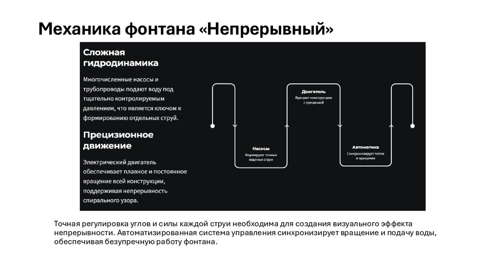 Механика фонтана «Непрерывный»Точная регулировка углов и силы каждой струи необходима для создания визуального эффекта