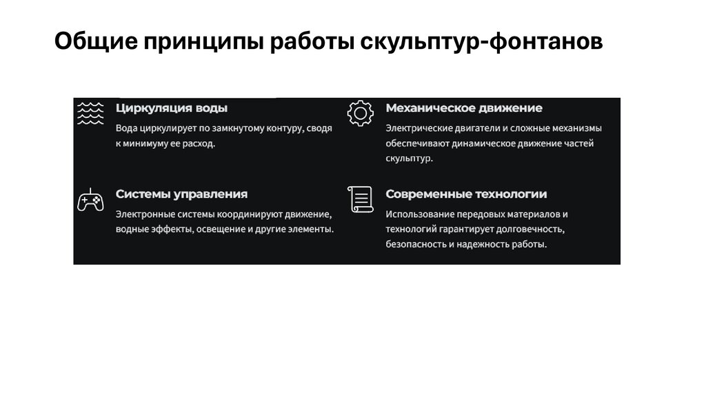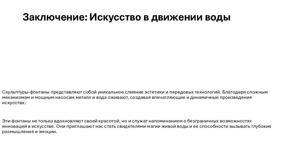 Заключение: Искусство в движении водыСкульптуры-фонтаны представляют собой уникальное слияние эстетики и передовых технологий. Благодаря сложным