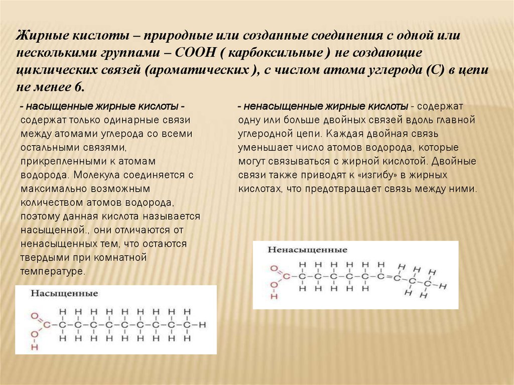 Жирные кислоты – природные или созданные соединения с одной илинесколькими группами – COOH ( карбоксильные ) не создающие