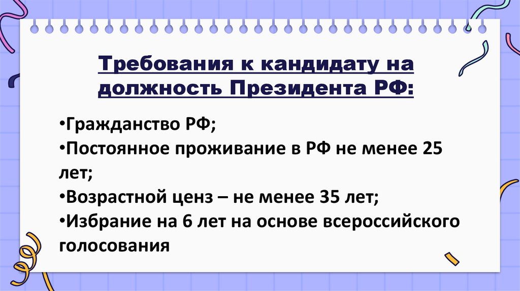 Требования к кандидату надолжность Президента РФ: