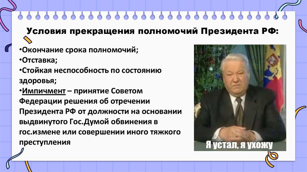 Условия прекращения полномочий Президента РФ:•Окончание срока полномочий;